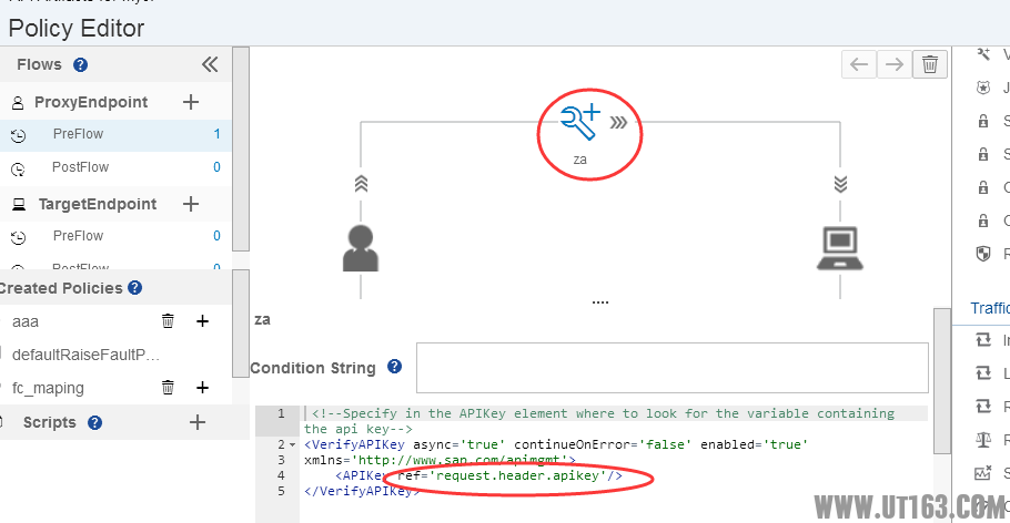5,在API 策略编辑时,先点击右上角的编辑按钮“EDIT”,使用Policies进入编辑状态,并点击“Verify API Key”边的的加号,增加Verify API Key策略,结果如图。