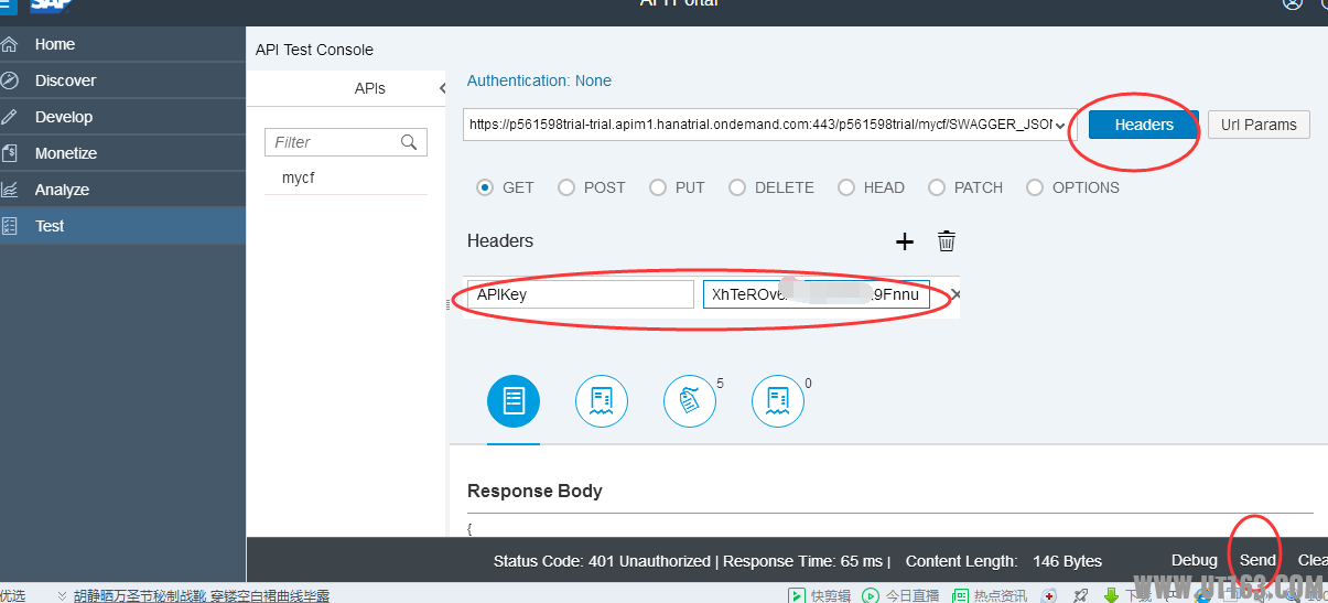 8,测试,在API PORTAL中进行测试时,这时需要把在第3步中得到的APIKey写入到Headers参数 中,否则报错: