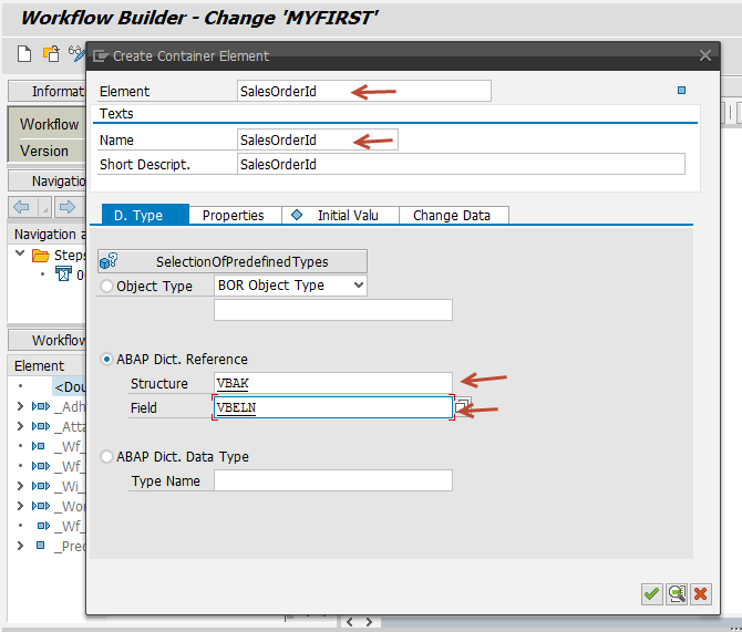D.Type – we define the data type of the element.We have a provision to choose an Business Object Type like BUS2035 etc. You can choose data dictionary structure fields and also direct data elements
