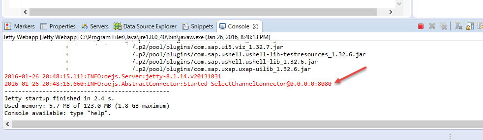 9. Now Jetty Webapp server will run and you can see the same in the server console like below. You can see the server is running at port 8080. This port will never change until you stop the server