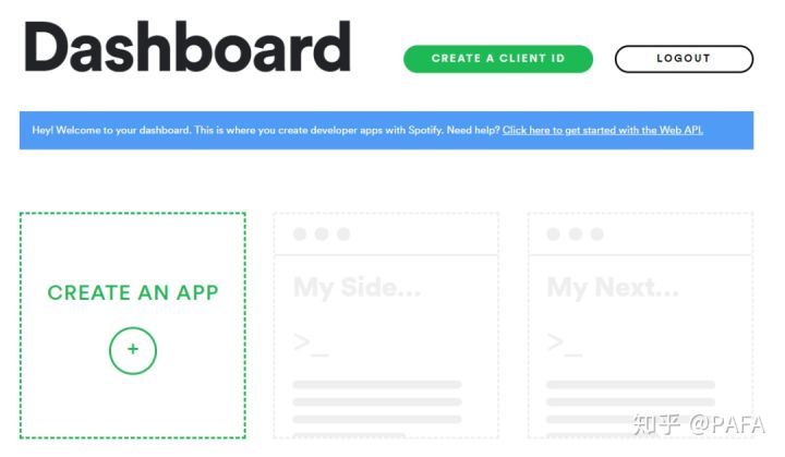 在选择选项之前,我们首先需要在 [开发人员仪表板中](http://developer.spotify.com/dashboard/applications) [注册应用程序](http://developer.spotify.com/documentation/general/guides/app-settings/#register-your-app) 。打开仪表板,然后选择“创建应用程序”选项。