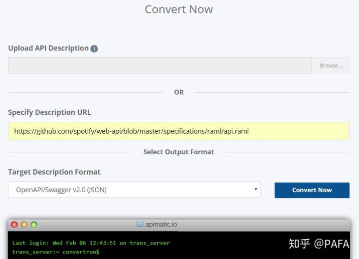 插入GitHub项目中可用的api.raml文件的URL,然后按Convert Now。系统执行脚本,几秒钟后您就会收到新的Swagger Web API定义的下载。