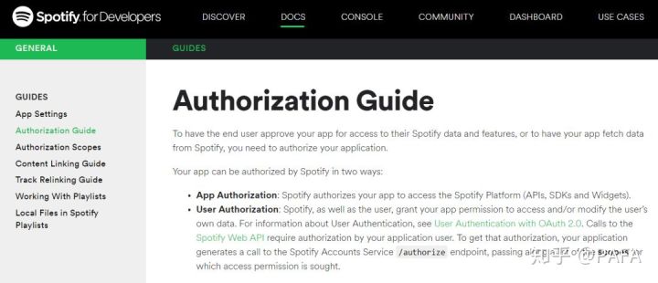 要了解可用的身份验证方法,让我们再一次探索Spotify开发人员文档,我们可以在[授权指南]中(http://developer.spotify.com/documentation/general/guides/authorization-guide/) 找到我们需要的所有相关信息。