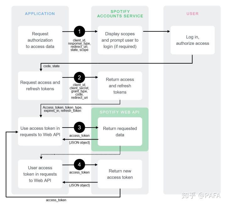 注意:应用程序(openconnectors)会触发初始身份验证请求,将用户重定向到Spotify Accounts Service,他需要确认访问权限,确认后应用程序将重定向回具有新“访问令牌”的“OAuth重定向URL”。使用此“令牌”,应用程序可以代表用户执行所有Web API操作,如果令牌过期,则通过Spotify Accounts Service请求新令牌而无需用户的交互。