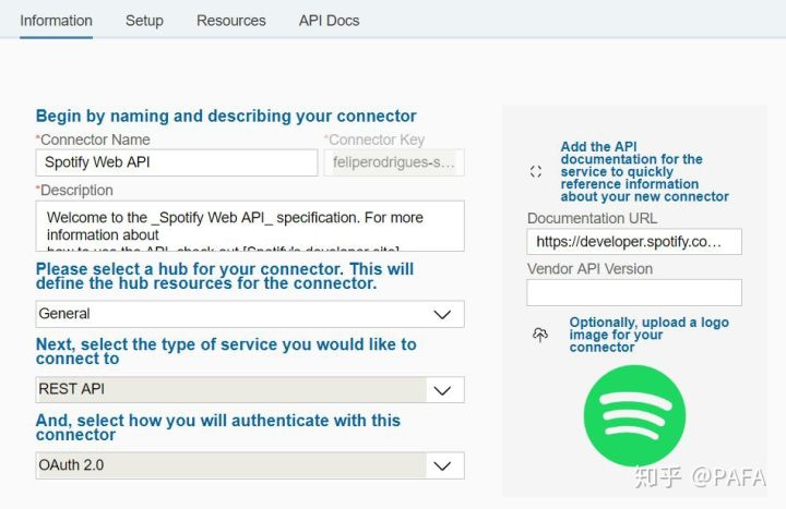 点击“Information”选项卡并更新连接器的文档和徽标。您可以从 [品牌指南](http://developer.spotify.com/branding-guidelines/) 页面下载其徽标。